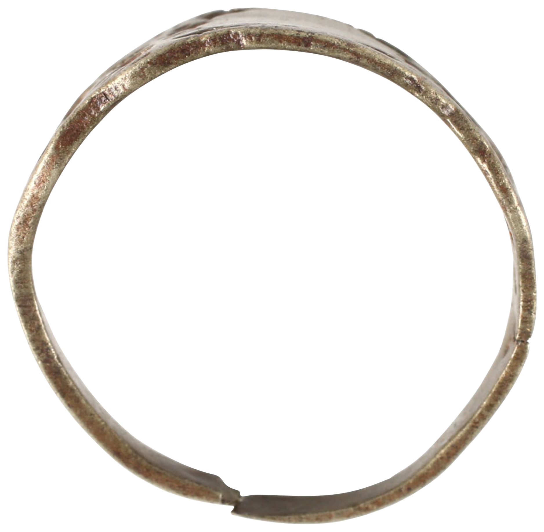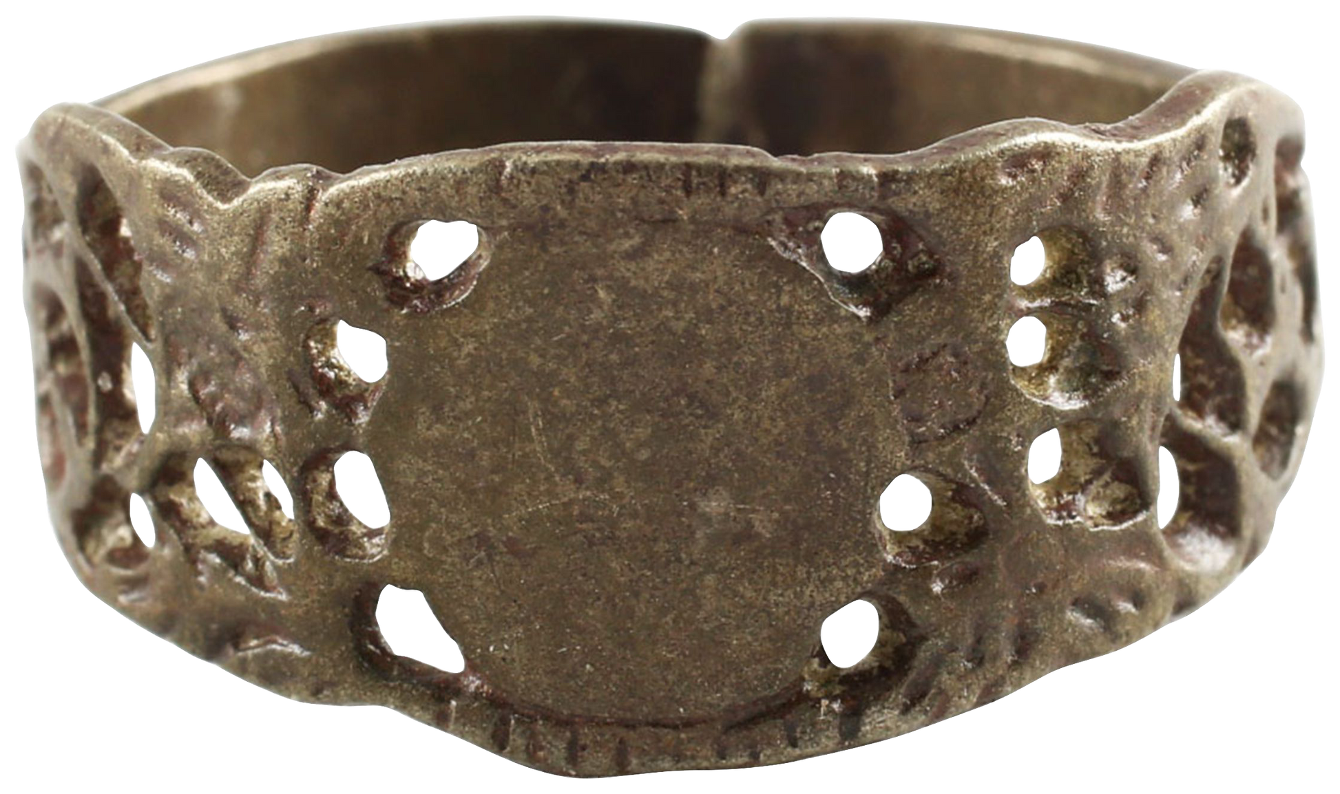 18th-19th century. Copper rich bronze, probably originally gilt. Size 13. Broad band flared to the foliate pierced bezel with a central circle.