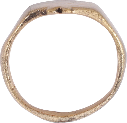 16th-early 17th century. Gilt bronze. Large size 8. 4.5mm rounded face band with circular bezel, not simply cut in but slightly domed and thicker than the band. A variation on the heart rings which were popular at the time, perhaps with special significance. Professionally refurbished with the 24karat gold surface restored and jewelry gift boxed with a certificate of authenticity.