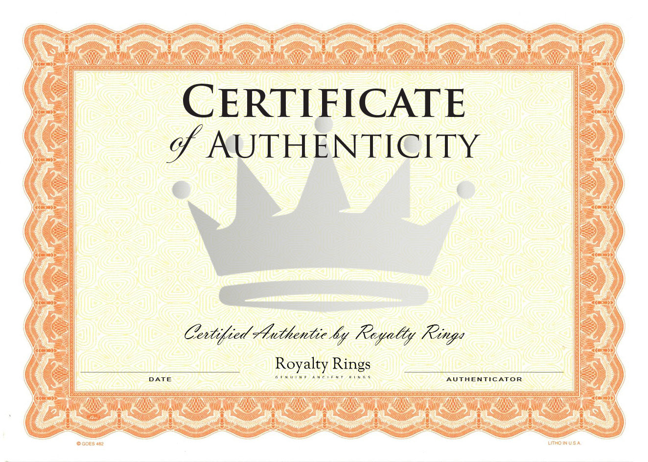 All items purchased from The Royalty Rings Store are accompanied by a signed and dated Certificate of Authenticity with the name of the item and its unique item number for future reference.